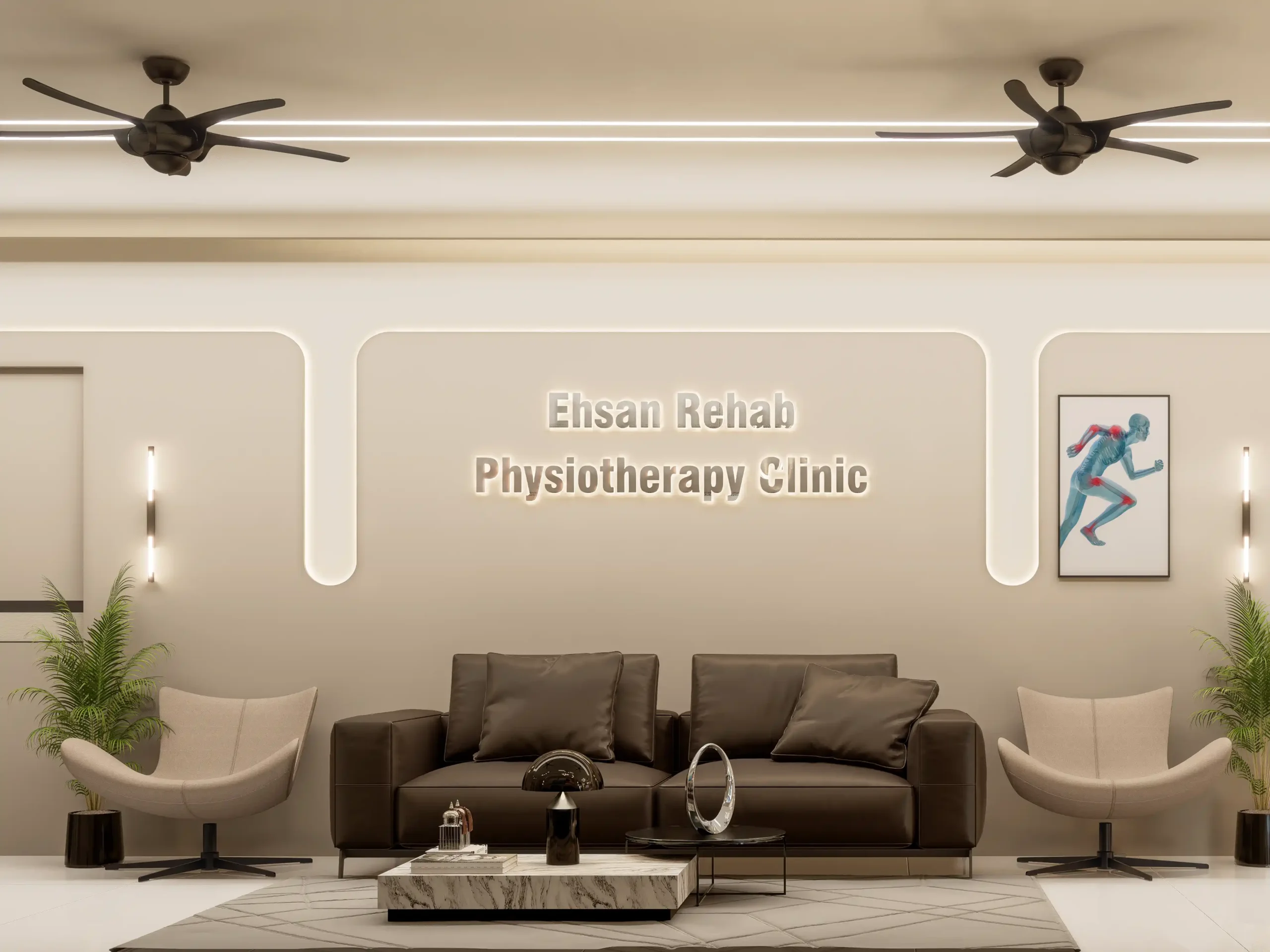 A calming and sophisticated reception lobby Interior designed for Ehsan’s Rehab: